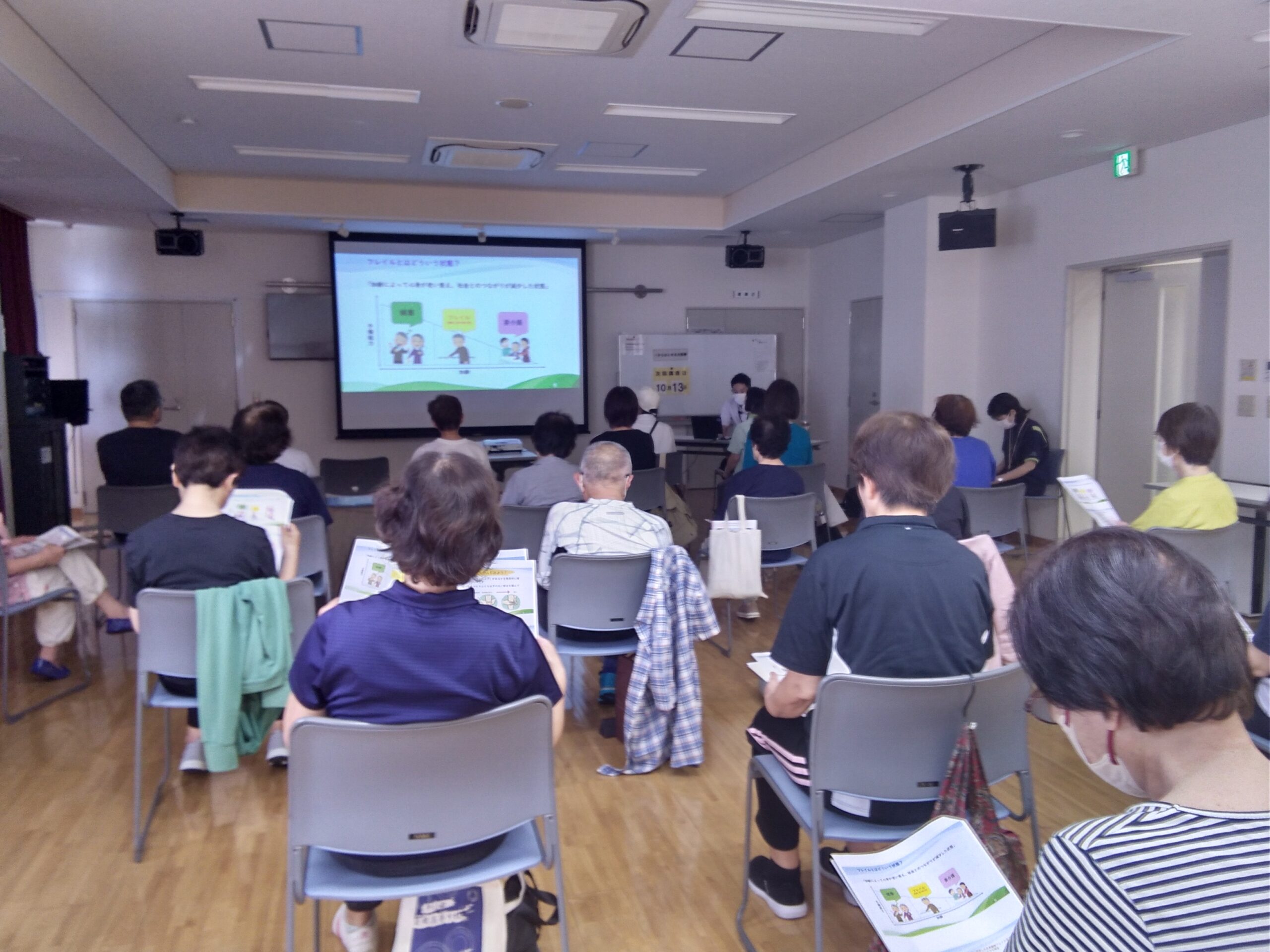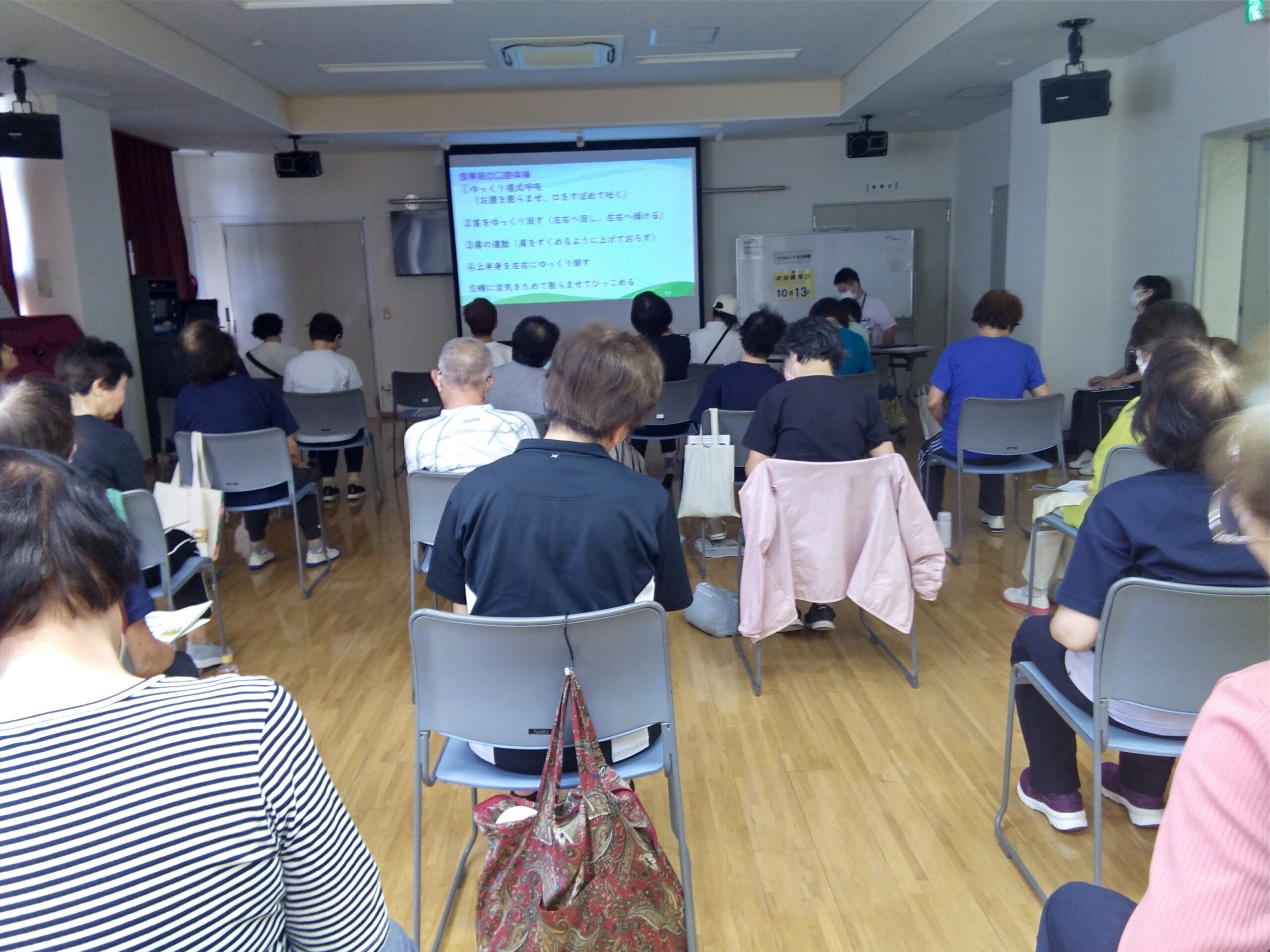 その後、リハビリデイサンスポーツ高槻富田 沖本克幸様に「元気、きらめき、ほほえみ体操」を指導していただきました。座学ではスクリーンを使い、熱中症の発生動向や病態など詳しく説明していただいた後、熱中症を防ぐ方法について教えていただきました。参加者の皆様はメモを取りながら熱心に聞かれていました。体操では先生の掛け声に合わせて、元気に数を数えながら全身のストレッチを行いました。脳トレも兼ねた体操も教えていただき、上手くいかない時にはみんなで笑い合える楽しい教室となりました。