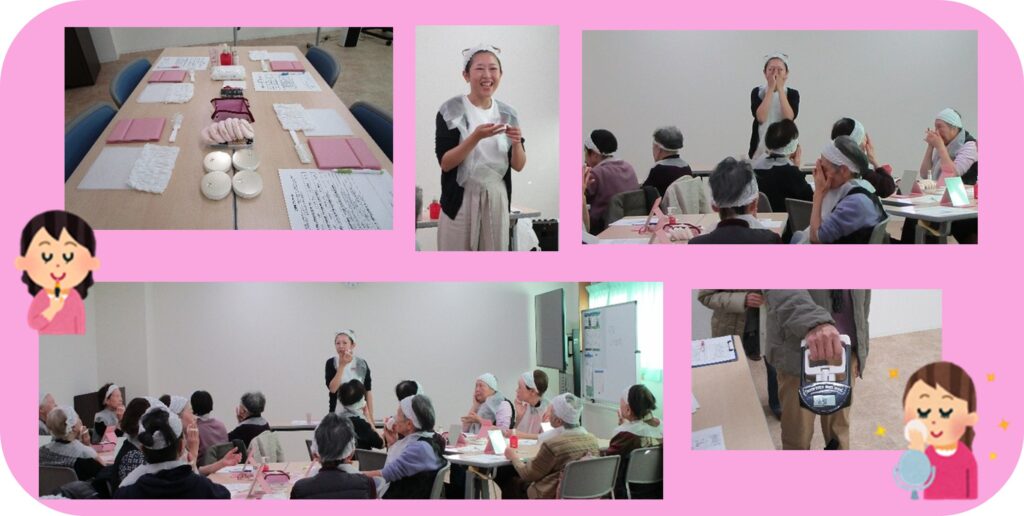 講座では、「化粧のちからで得られる健康寿命のための3つの秘訣」として身体活動(化粧品容器のフタを開ける、眉を描くなど上肢の筋力、握力アップにつながる)、社会参加(笑顔になり、活力がわく、人に会いたくなる)、栄養(唾液腺を刺激するスキンケアで唾液分泌を促す)などの話しを聞きました。